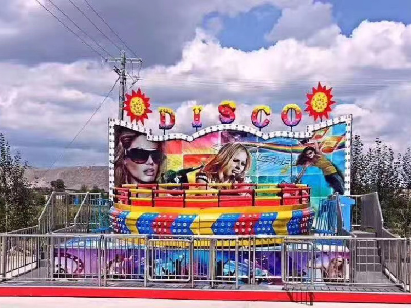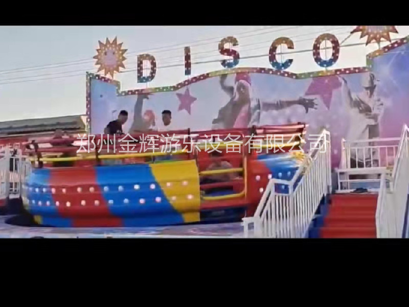 迪斯科轉盤是陀螺類回轉大型游樂設備。游客乘坐的吊箱在強離心力作用下,旋轉翻飛,仿佛被推入越時空的天體,翻江倒海,天旋地轉,驚心動魄的刺激,風馳快感,令人回味無窮。
